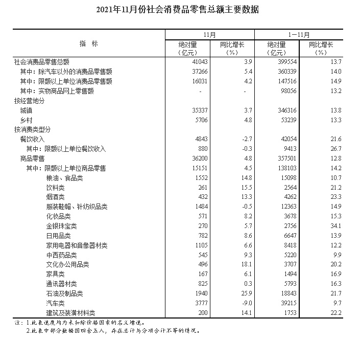 智通财经APP获悉,据国家统计局公布的数据显示,2021年11月份,社会消费品零售总额41043亿元,同比增长3.9%;比2019年11月份增长9.0%,两年平均增速为4.4%。其中,除汽车以外的消费品零售额37266亿元,增长5.4%。扣除价格因素,11月份社会消费品零售总额同比实际增长0.5%。从环比看,11月份社会消费品零售总额增长0.22%。