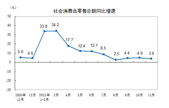 11月份,社会消费品零售总额41043亿元,同比增长3.9%;比2019年11月份增长9.0%,两年平均增速为4.4%。其中,除汽车以外的消费品零售额37266亿元,增长5.4%。扣除价格因素,11月份社会消费品零售总额同比实际增长0.5%。从环比看,11月份社会消费品零售总额增长0.22%。