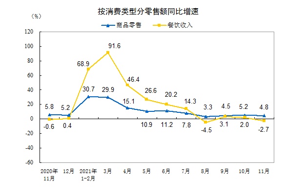 按消费类型分,11月份,商品零售36200亿元,同比增长4.8%;餐饮收入4843亿元,同比下降2.7%。1—11月份,商品零售357501亿元,同比增长12.8%;餐饮收入42054亿元,增长21.6%。