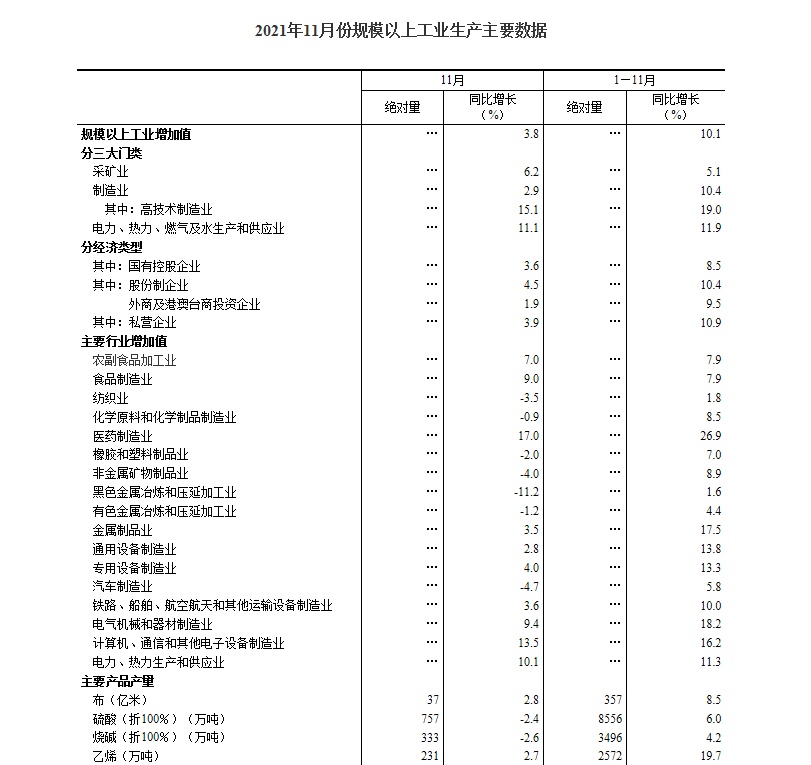 智通财经APP获悉,据国家统计局数据显示,11月份,规模以上工业增加值同比实际增长3.8%(以下增加值增速均为扣除价格因素的实际增长率),比2019年同期增长11.1%,两年平均增长5.4%。从环比看,11月份,规模以上工业增加值比上月增长0.37%。1—11月份,规模以上工业增加值同比增长10.1%,两年平均增长6.1%。