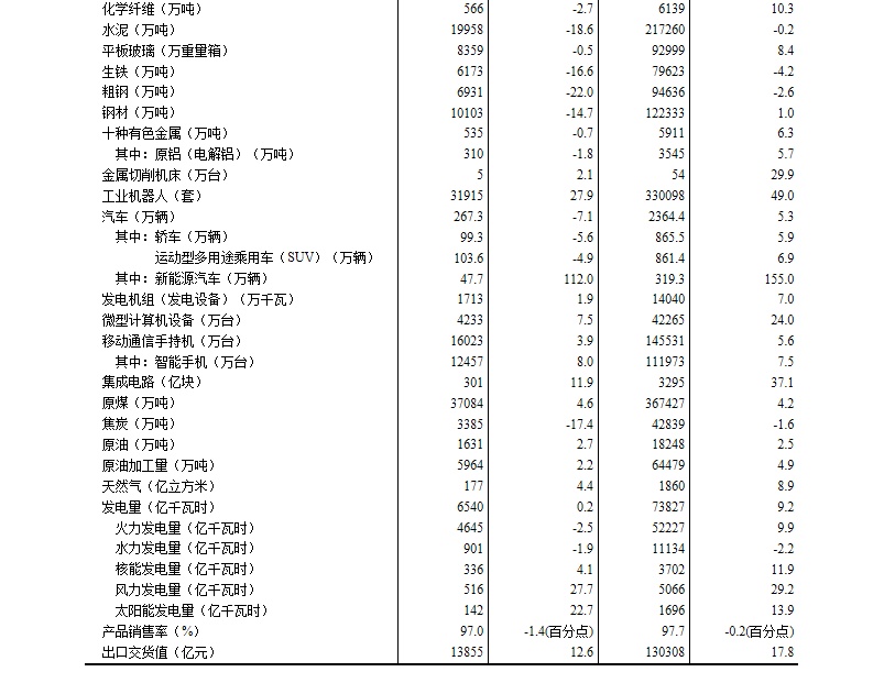分产品看,11月份,612种产品中有283种产品产量同比增长。钢材10103万吨,同比下降14.7%;水泥19958万吨,下降18.6%;十种有色金属535万吨,下降0.7%;乙烯231万吨,增长2.7%;汽车267.3万辆,下降7.1%,其中,新能源汽车47.7万辆,增长112.0%;发电量6540亿千瓦时,增长0.2%;原油加工量5964万吨,增长2.2%。