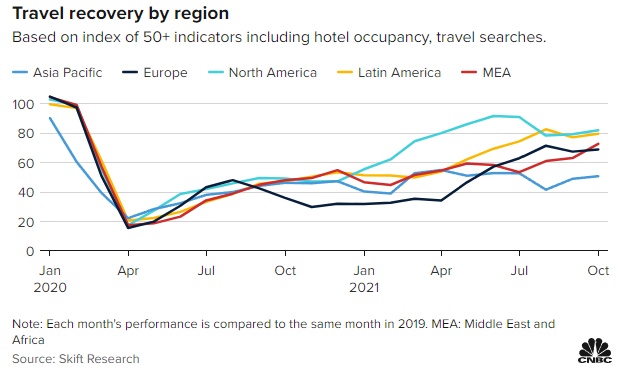 旅游业媒体Skift的一项分析显示,不同地区的旅游业复苏情况仍然不均衡。该分析使用了包含50多个不同指标的指数来衡量不同地区的复苏情况,并于疫情前的行业状况进行了比较。这些指标包括旅游搜索、酒店入住率、每晚收入和预订取消量。