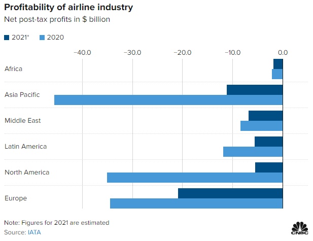 根据国际航空运输协会(International Air Transport Association)的估计,航空业在2020年录得净亏损,预计这一趋势将持续到今年。不过,该协会今年10月发布的一份报告中称,今年的亏损可能会减少。