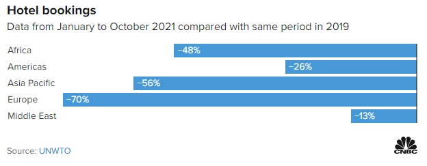 除了航空业盈利能力,酒店预订在2021年也恢复缓慢。联合国世界旅游组织(United Nations World Tourism Organization)收集的数据显示,不同地区的酒店预订量差异很大。