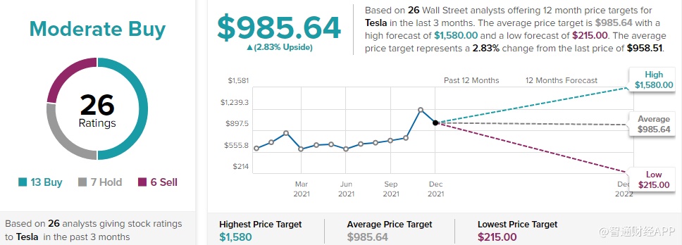 在过去的3个月里,26位分析师对特斯拉的前景进行了评估,其中13位给予“买入”评级,7位给予“持有”评级,6位给予“卖出”评级,共识评级为“适度买入”,平均目标价为985.64美元,较当前水平上涨3%。