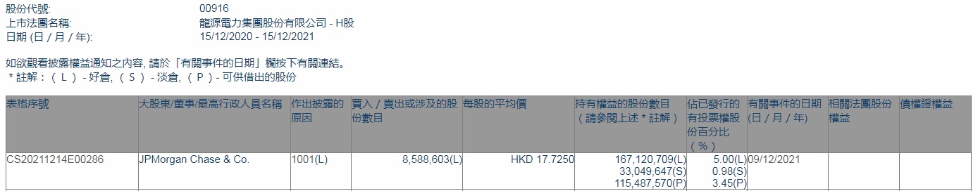 智通财经APP获悉,香港联交所最新资料显示,12月9日,小摩增持龙源电力(00916)约858.86万股,每股作价17.725港元,总金额约为1.52亿港元。增持后最新持股数目约为1.67亿股,最新持股比例为5.00%。