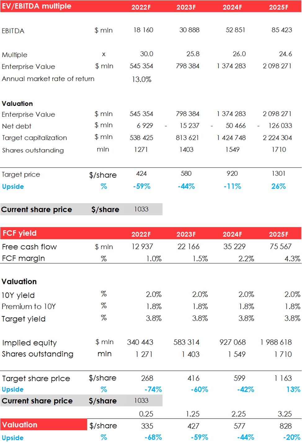 Invest Heroes根据平均EV/EBITDA倍数和2025年FCF收益率,在FTM估值体系中使用13%折现因子对特斯拉股票进行估值。