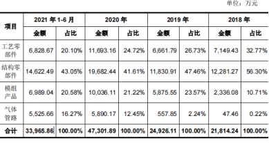 分产品来看,公司各产品板块收入整体呈上升趋势。其中,公司结构零部件在报告期为公司主要收入来源,各期实现的销售额占主营业务收入的比例分别为56.30%、47.46%、41.61%和43.05%,呈下降趋势。于此同时,模组和气体管路产品销售规模和主营业务收入占比不断提升。模组产品收入占比由2018年的10.71%升至2021年1-6月的20.58%,气体管路收入占比则由2018年的0.22%大增至2021年1-6月的16.27%。这主要受益于公司工艺技术和产品结构日趋完善,尤其是多种模组和气体管路产品通过客户A等客户认证后批量供货,该两类产品销售规模持续扩大。