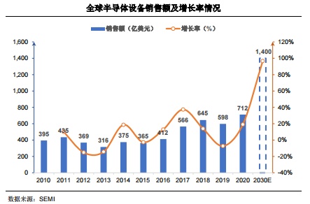 近年来,随着市场需求及技术的更新迭代,半导体产业的发展日新月异,不断推动半导体设备的数量增长及产品升级。据WSTS统计,2010年到2020年,全球半导体产品市场规模从2,983亿美元迅速提升至4,404亿美元,预计到2030年,全球半导体市场规模有望达到万亿美元。半导体设备的市场景气度与半导体市场规模高度相关,全球半导体行业为满足强劲需求也在持续扩大产能。根据SEMI统计,全球半导体设备销售规模从2010年395亿美元增长到2020年的712亿美元,2021年半导体制造设备全球销售总额将达到1030亿美元的新高,同比大增44.7%。而预计到2030年全球半导体设备销售额将增长至1400亿美元。