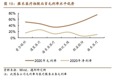 首先看毛利率,以雍禾医疗为例,公司的毛利率常年维持在70%以上,主要业务植发医疗服务和医疗养固服务今年上半年的毛利率分别为72.5%和77.8%。横向对比医美、眼科等项目,雍禾医疗的毛利率水平具备一定优势。