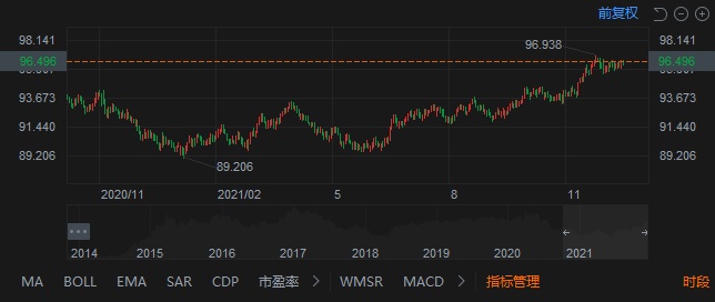 智通财经APP获悉,据一项调查显示,各大央行因急于遏制通胀飙升而作出的政策转变,可能是明年全球股市面临的最大下行风险,而美元也不例外。对于美元来说,美联储政策走在路上通常比到达终点要好。而在如今通胀高企的大背景下,美元指数仍比去年同期上涨近7%,截至发稿,美元指数报96.495。