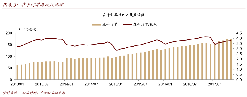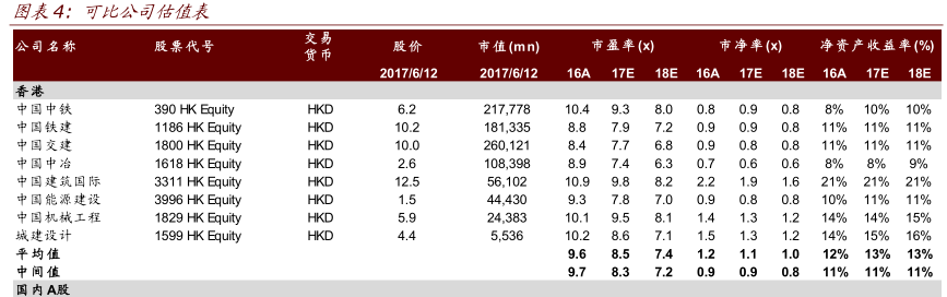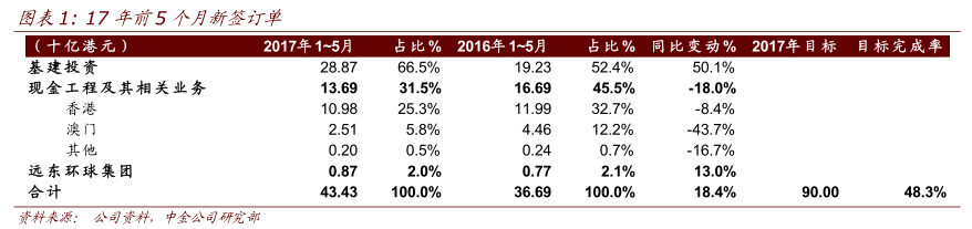内地PPP ,维持强势, 港澳业务下半年有望回暖。2017 年1~5月,公司内地/香港/澳门地区分别新签订单289亿港元/110亿港元/25亿港元,分别同比增长 50%/下降 8%/下降 44%。PPP 业务势头良好,港澳业务或将于下半年回暖,全年有望实现同比持平。整体来看,业务结构的调整有利于盈利能力的改善。另外,2017 年1~5 月新签订单已完成了全年目标的48.3%。