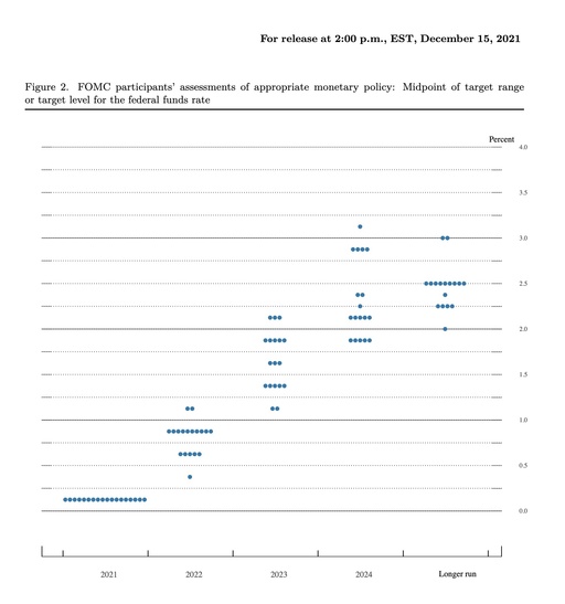 美联储点阵图显示,所有委员均预计美联储将在2022年开始加息,具体为2022年和2023年分别加息三次。委员们对政策举措持鹰派态度,坚定地倾向于加息。在18名FOMC委员中,只有6名预计明年加息不到3次,且没有任何委员看到明年利率保持当前近零水平。
