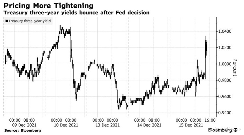 智通财经APP获悉,周三,在美联储公布12月利率决议后,较短期限的美国国债收益率上升,美国货币市场转向为美联储在2022年底前将利率提高三个四分之一点定价。