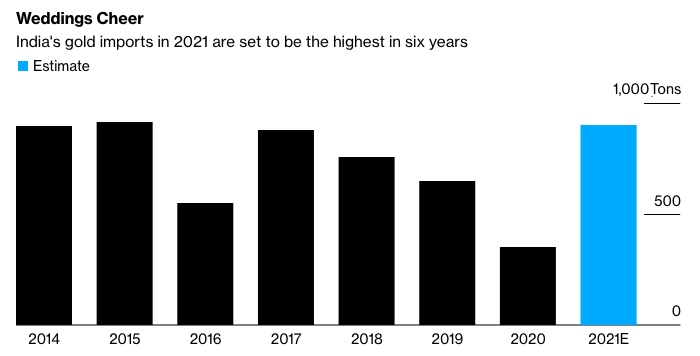 Metals Focus Ltd表示,今年的黄金旺季可能推动印度黄金进口量增至900吨,为六年来最高水平。据世界黄金协会的数据,这一数字远高于去年的进口量(约350吨)。