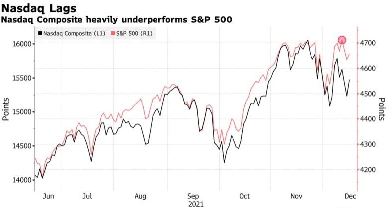 科技股估值已飙升至上世纪90年代末互联网泡沫时期的水平,高估值让一些厌恶风险的投资者担忧。纳斯达克综合指数较11月19日的高点下跌了1.9%,而同期的标普500指数上涨了0.1%。