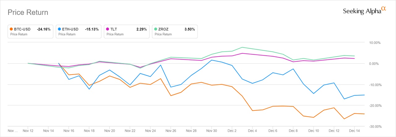 在意识到风险资产不断上升的波动性、创纪录的高估值以及美联储变得更加鹰派的背景下,过去一个月,投资者似乎更倾向于购买债券,例如安硕20年期以上美国国债(TLT.US)等,而不是加密货币。