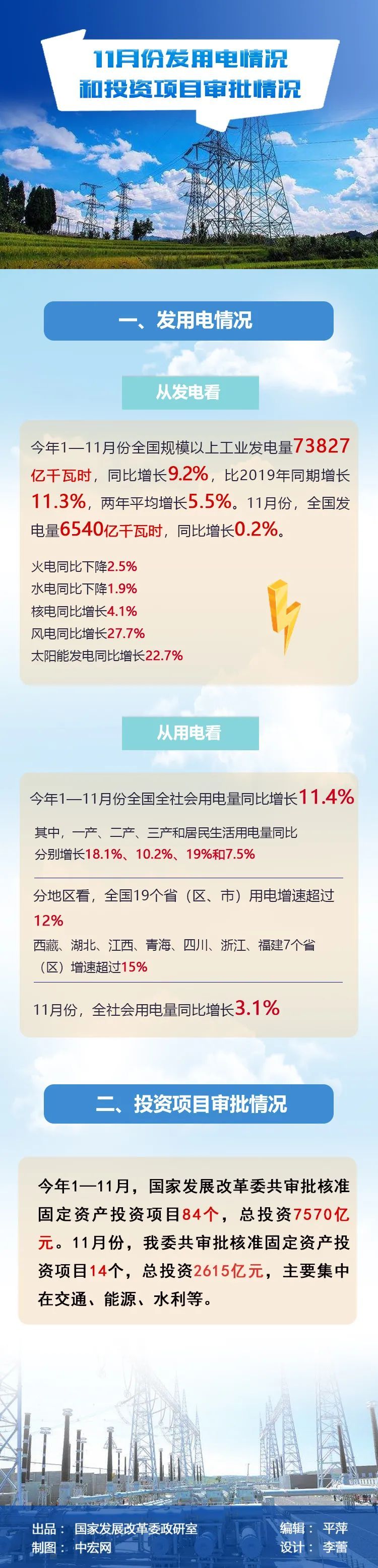 智通财经APP获悉,12月16日,国家发展改革委员会公布11月份发用电情况和投资项目审批情况。11月份,全国发电量6540亿千瓦时,同比增长0.2%;全社会用电量同比增长3.1%;发改委共审批核准固定资产投资项目14个,总投资2615亿元,主要集中在交通、能源、水利等。