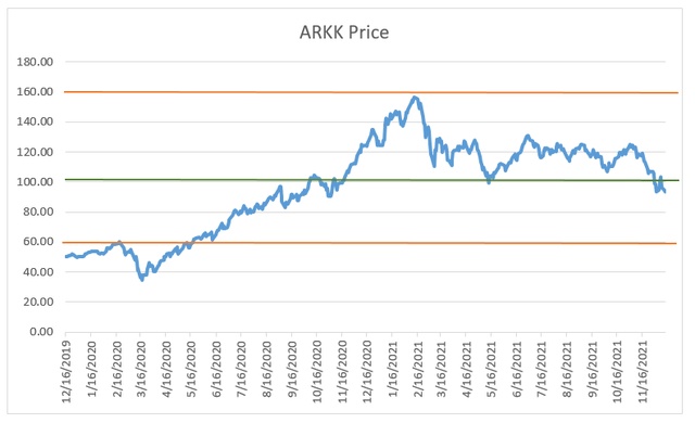虽然从5年或者10年的时间跨度来看,ARKK的前景是光明的,但分析预计,它在未来14个月将面临着巨大挑战,明年或将出现接近50美元的大幅回调。目前,机构投资者正在放弃未实现盈利以及市盈率过高的科技股,而投资者也正在加快获利了结的步伐,因此资金将继续出现外流,该ETF在触底反弹之前将持续走弱。从技术角度来看,每股73美元或许是下一个目标水平。