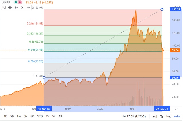 此外,ARKK的斐波那契分析同样描绘了一幅黯淡的画面。该基金过去两年的价格高点和低点显示,其回调位分别为91.15美元和73.26美元,对应着61.8%和78.6%的回调水平。这仅仅意味着,通过观察股票过去的表现以及它在上涨过程中的表现,技术分析师可以确定在回调期间将作为支撑位的价格点。