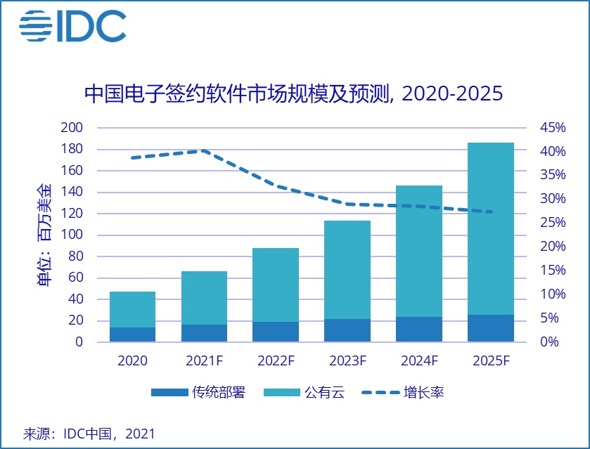 智通财经APP获悉,IDC《2020年中国电子签名软件市场份额》显示,2020年中国电子签名软件市场规模为4734万美元,同比增长38.7%。预计到2025年中国关系型数据库软件市场规模将达到1.8亿美元,未来5年整体市场年复合增长率为31.5%。未来公有云模式的电子签名软件的增速要远远高于传统部署模式,电子签名SaaS软件未来5年复合增长率为35.3%。
