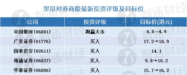 智通财经APP获悉,里昂发布研究报告称,在中资券商中首选仍然是广发证券(01776),因其四分之一收入来自共同基金,相关业务的健康发展受到投资者和监管机构的欢迎,予“买入”评级,目标价由17.2港元上调至18.9港元,其他中资券商股目标价详见另表。