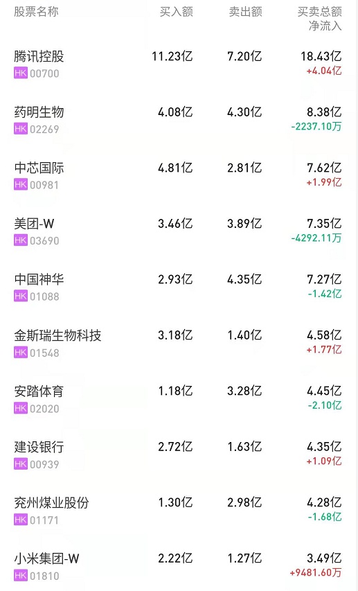 港股通(深)十大活跃成交股