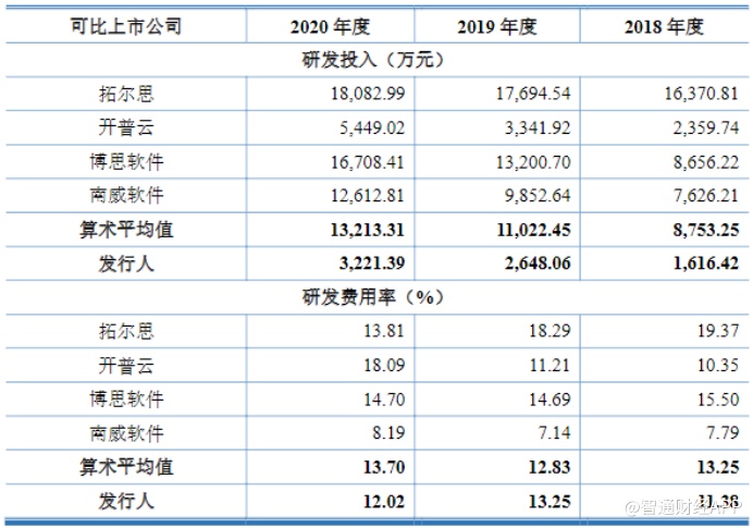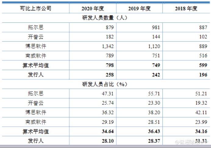 并且从市场可比公司的技术力对比情况来看,大汉软件在研发人员数量及研发人员的总员工数占比上仅高于开普云,在这两项指标上均低于行业算术平均值。