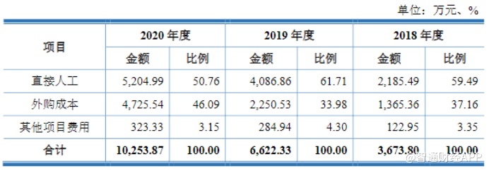 从成本端来看,公司的成本包括直接人工成本、外购成本和其他项目费用三大项。其中前两项占公司总成本的比重超过90%。而在2020年,公司外购成本较上年同期大幅增长,原因在于报告期内,公司承接的大型项目数量增多、建设内容日趋多元化复杂化,因涉及人力资源规模制约、硬件部署专业化分工等需要对外采购的情形增多,使得公司外购成本占营业成本比例逐渐提升。
