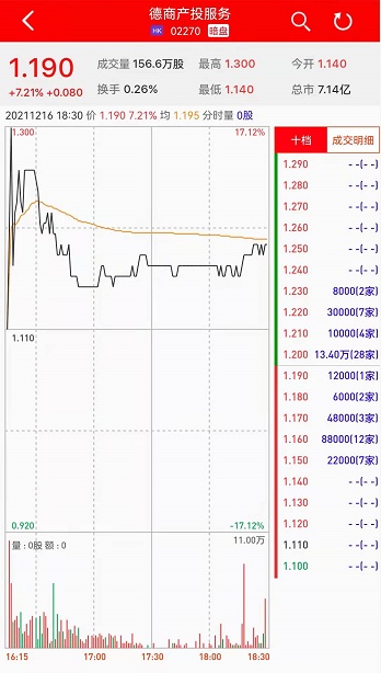 智通财经APP获悉,德商产投服务(02270)将于12月17日(星期五)在香港挂牌。截至收盘,利弗莫尔证券暗盘交易显示报价1.19港元,较招股价1.11港元升7.21%。每手2000股,不计手续费,每手赚160港元。