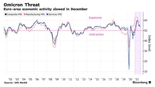 Williamson对此表示:“欧元区经济正受到疫情的又一次打击,不断上升的新冠病例抑制了服务业的增长,导致2021年底的经济形势令人失望。展望未来,预计Omicron变种将对增长前景构成进一步的下行风险。”