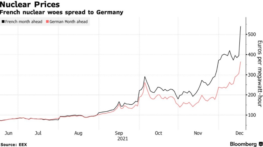 智通财经APP注意到,欧洲电力价格飙升至历史新高,此前法国电力公司(Electricite de France SA)宣布,将有两座核反应堆意外停堆,还有两座反应堆将长期停堆,而此时正值欧洲大陆遭遇寒流,天然气库存已经耗尽。