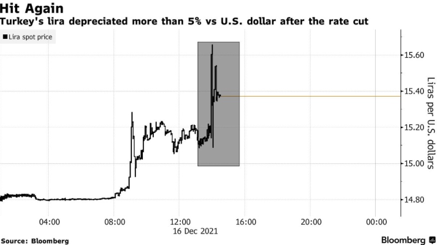 利率决议公布后,里拉兑美元汇率下跌 5.4%。在总统埃尔多安的压力下,土耳其央行的官员们将将利率再下调 100 个基点至 14%,与媒体调查的中值估计一致。