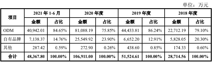按业务类型划分,奥尼电子的业绩主要由ODM贡献,2018年-2020年公司来自该模式的收入分别为2.27亿元、4.44亿元、8.11亿元,占总收入比例为79.1%、86.24%、75.85%;同期,公司来自于自有品牌的收入分别由2018年的5828.05万元增长至2.55亿元,收入占比则徘徊在20%上下。
