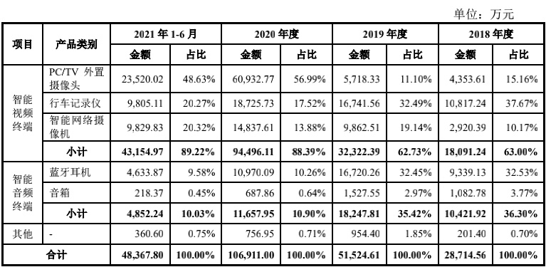 根据披露,奥尼电子的智能视频终端包括了PC/TV外置摄像头、行车记录仪、智能网络摄像机,就收入变动来看,PC/TV外置摄像头业务的放量是刺激公司整体收入爆发的最主要因素。期内,公司的PC/TV外置摄像头业务的收入由2018年的4353.61万元暴增至2020年的6.09亿元,占比亦水涨船高由15.16%提升至56.99%。