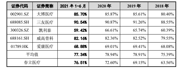 招股书披露,报告期内,春立医疗的标准关节假体产品-髋、标准关节假体产品-膝、脊柱类植入产品合计收入占主营业务收入的比例分别为 89.94%、90.64%、91.22%及 90.45%,构成公司的主要产品。