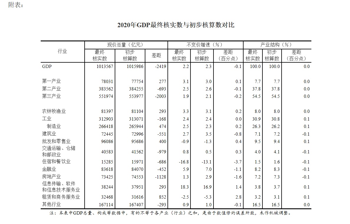 经最终核实,2020年,GDP现价总量为1013567亿元,比初步核算数减少了2419亿元;按不变价格计算,比上年增长2.2%,比初步核算数下降0.1个百分点。三次产业和各行业数据见附表。