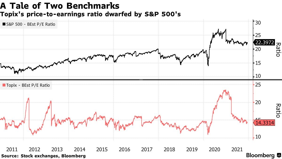 长时间的疫情紧急状态削弱了日本的支出和增长。虽然东证指数上涨 12% ,成为2021年亚太地区表现较好的指数之一,但仍落后 MSCI 全球指数约 6 个百分点。日本东证指数和美国标普500指数的市盈率差值达到历史新高,刺激投资者押注日本股市将迎头赶上。