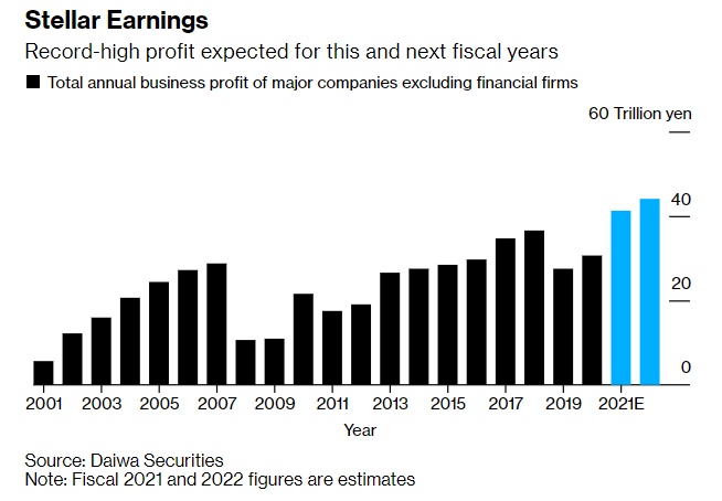 高盛策略师Kazunori Tatebe表示,"低估值和外国投资者的低敞口都将对日本股市有利。" 随着重新开放的步伐加快,Tatebe认为外国资金将“大量流入”。他估计,自疫情开始以来,外国资金已经卖出了多达7万亿日元(合613亿美元)的日本股票。