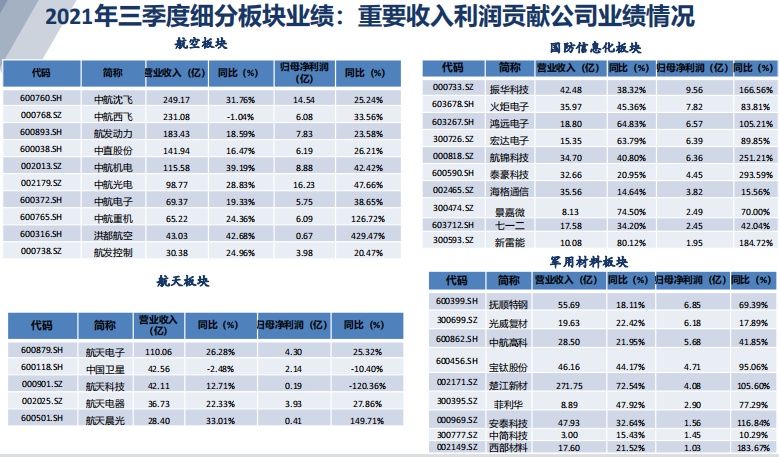 军工板块营业收入、归母净利润增长稳定快速,且毛利率、净利润率、ROE处于快速增长态势。整体来看,军工板块在军改后需求快速增长,收入利润在2020年出现显著的提升,2021年三季度延续了这个趋势,维持业绩的快速增长。同时,军改后军工整体产品升级、规模效应提升,毛利率、净利率和ROE提升显著。