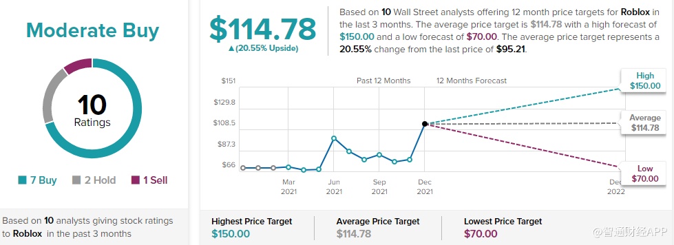 总而言之,大多数分析师仍然支持Roblox。有 7 位分析师予该股“买入”评级, 2 位予“持有”评级,1位予“卖出”评级,共识评级为“适度买入”,平均目标价为114.78美元,上涨空间达21%。