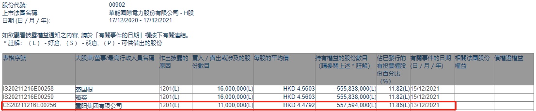 智通财经APP获悉,香港联交所最新资料显示,12月13日,重阳集团减持华能国际电力股份(00902)1100万股,每股作价4.4792港元,总金额为4927.12万港元。减持后最新持股数目约为5.58亿股,最新持股比例为11.86%。