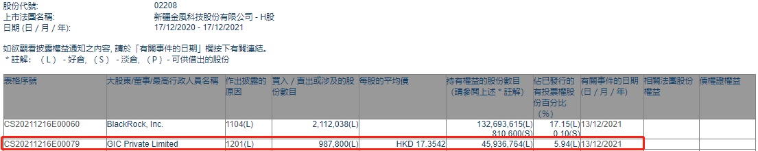 智通财经APP获悉,香港联交所最新资料显示,12月13日,GIC Private Limited减持金风科技(02208)98.78万股,每股作价17.3542港元,总金额约为1714.25万港元。减持后最新持股数目约为4593.68万股,最新持股比例为5.94%。