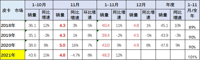 智通财经APP获悉,根据乘联会最新数据显示,2021年11月份皮卡市场销售4.8万辆,同比下降4.7%,环比增长8%。2018年皮卡销量增长10%。2019年皮卡累计销量44万辆,同比下降3%。但2020年同比增长9%。2021年皮卡批发市场走势相对较强,原因是2020年起步较低,由于2020年的年初市场异常低迷,因此不可避免。2021年11月相对于2018年和2019年同期表现相对平稳,这也是恢复常态的体现。