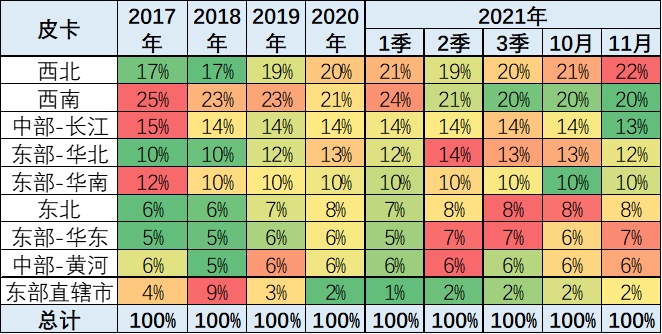 皮卡市场的区域在西北、西南为主,西部地区的皮卡需求较大。目前来看,西南、西北地区的皮卡需求占到总体需求的40%以上,成为两大核心市场。西部市场近期保持相对稳定的态势并没有明显的收缩特征。而目前增长相对比较快的是华北地区和中部黄河地区,包括东北地区皮卡市场也有明显的启动特征。但是目前来看华东、华南地区的皮卡市场并没有大幅的增长。
