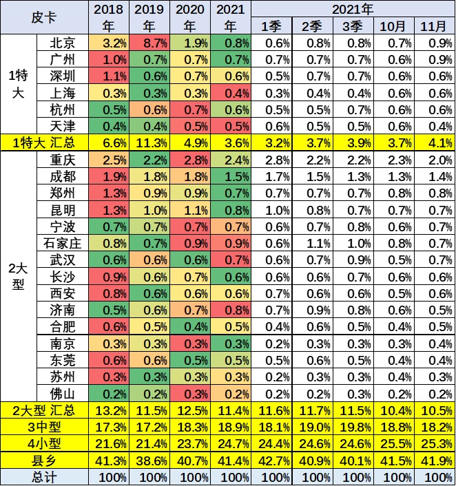皮卡市场目前主要的销售区域还是以中小城市和县乡市场为主,尤其是县乡市场目前的表现相对来说还是较强。今年1-11月的县乡市场表现尤其突出的特征。而中型城市市场保持稳定,大城市市场目前来看并没有明显的突破特征。