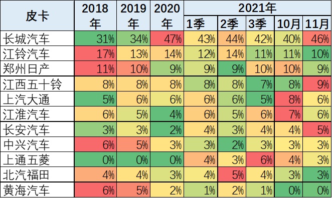 2021年一季度皮卡市场依旧保持1超多强的走势特征,但4-11月开始逐步体现分化的趋势。长城汽车的皮卡销量一枝独秀,近几年长城汽车皮卡销量份额持续提升,2019年占皮卡总销量的34%,2020年保持皮卡总销量的47%,今年11月的市场销量份额达到46%。