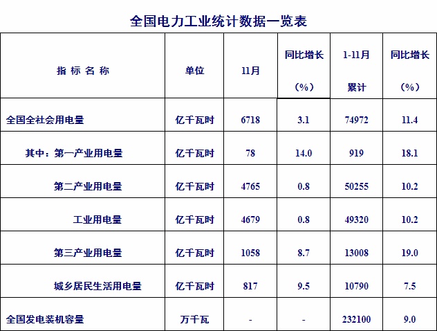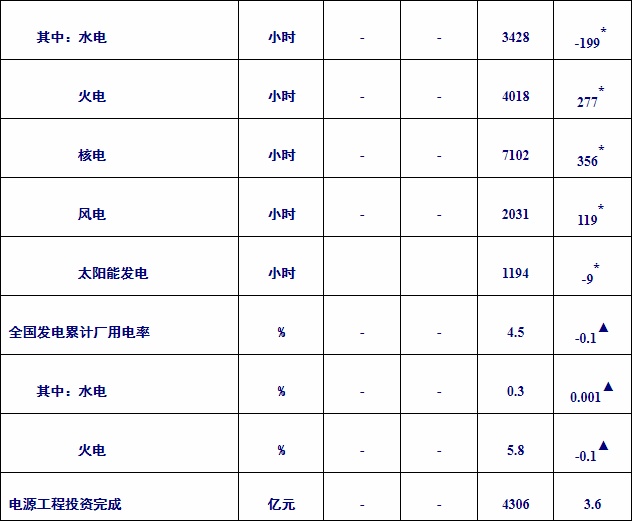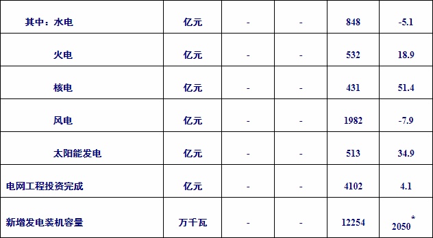 1-11月份,全国主要发电企业电源工程完成投资4306亿元,同比增3.6%,其中,水电848亿元,同比下降5.1%;太阳能发电513亿元,同比增长34.9%。电网工程完成投资4102亿元,同比增长4.1%。