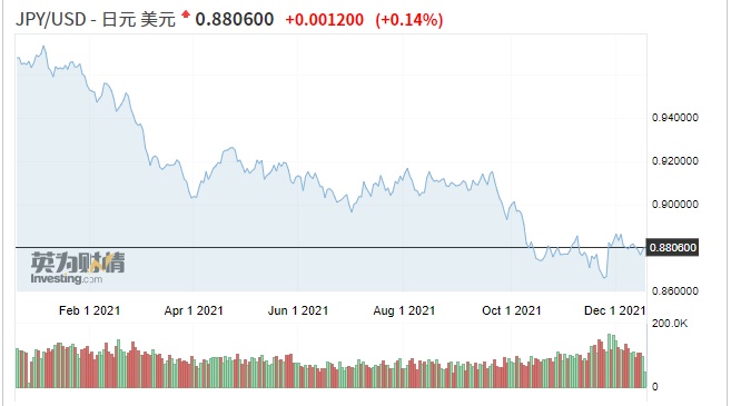 据统计,2021年日元兑美元汇率下跌约9.5%,美联储明年加快缩债规模和加息预期可能会在2022年给日元带来进一步的下行压力。