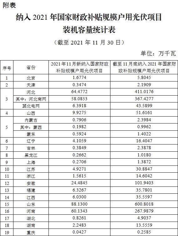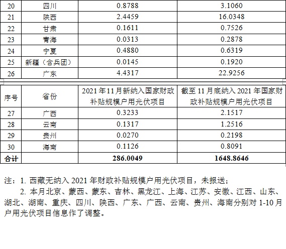 智通财经APP获悉,12月17日,经国家可再生能源信息管理中心梳理统计,2021年11月新纳入国家财政补贴规模户用光伏项目总装机容量为286万千瓦。截至2021年11月底,全国累计纳入2021年国家财政补贴规模户用光伏项目装机容量为1648.86万千瓦。